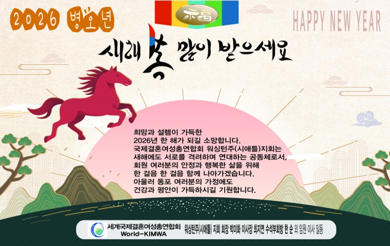 2026년이 월드킴와 워싱턴주 지부와 모든 회원 여러분께 새로운 도약과 희망의 해가 되길 바랍니다. 서로를 존중하고 배려하며, 작은 나눔이 큰 희망으로 이어지는 따뜻한 한 해를 함께 만들어갑시다.
